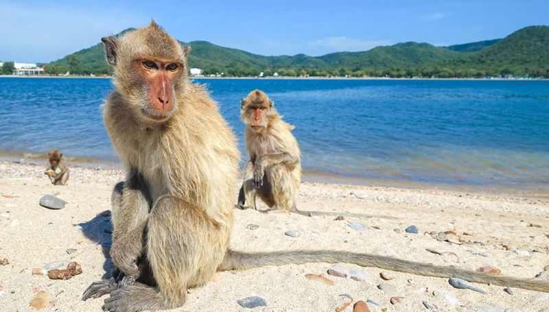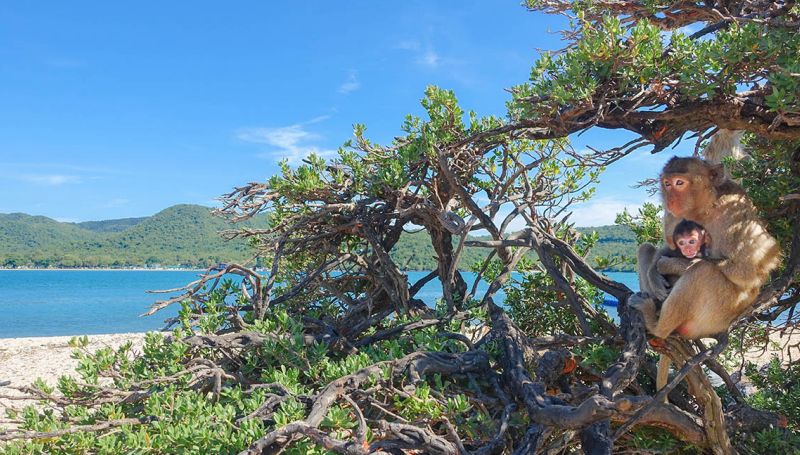 Next stop on the tour is the island of Koh Ped literally translated as Duck Island, although there is not a duck in sight there are monkeys abound. Koh Ped or perhaps more appropriate, Koh Ling (Ling meaning monkey) has a resident population of Thai Samae monkeys, but once again no human inhabitants. A ramshackle sun shelter and worn down mermaid statue adorn the coastline along with thousands of monkeys, who often swim out to the boats to receive food or scavenge what they can find. The dingy ferries passengers to the island, where an offering of fruit and vegetables are given to the monkeys, whilst tourists are free to pose for photographs and play with the lovable primates. Due to the monkeys over population of the island a natural, self sustaining food source is no longer present on Koh Ped; as such they are solely reliant on the tour boats as a source of food at present, whilst conservation strategies are being discuses