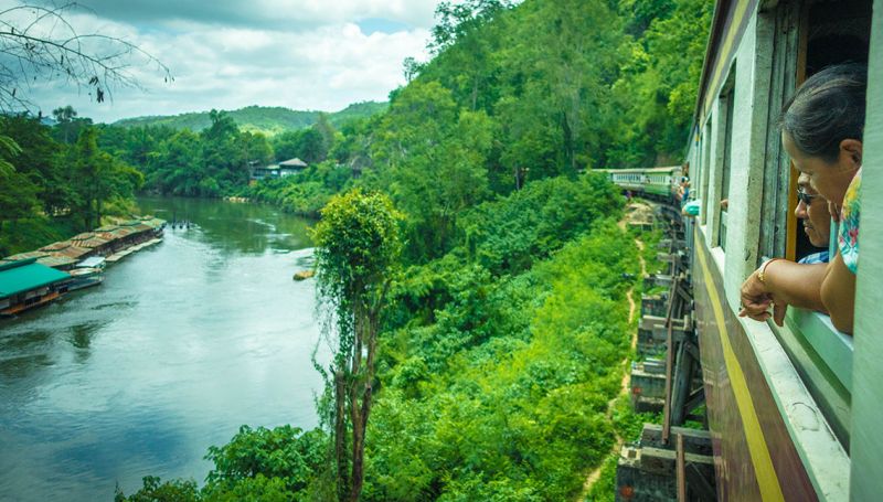 Train ride on Death Railway through magnificent scenery, passing over the original wooden viaduct constructed by Allied POWs.
