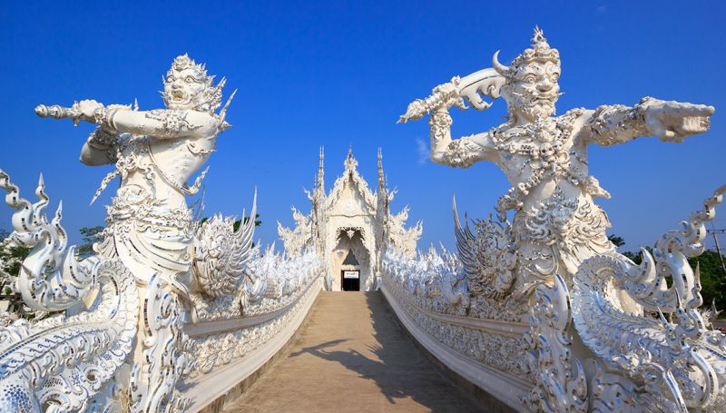 Visit Rong Khun Temple (White’s Temple), designed by the famous national artist. The main temple building is a distinctive white color, decorated with fragments of reflective glass which can be seen from afar.