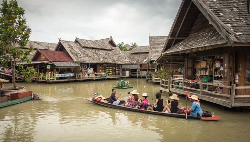 More than 80 paddle boats are on standby to ferry visitors around the compound along many Thai style teak wood buildings, linked by a network of canals, bridges and a number of different sized islands with exotic plants and trees. The boat trip will slowly expose the richness of the surrounding architectural and cultural river side living. Water vendors moving with their paddle boats from dock to dock and offering their unique range of freshly cooked delicious dishes.