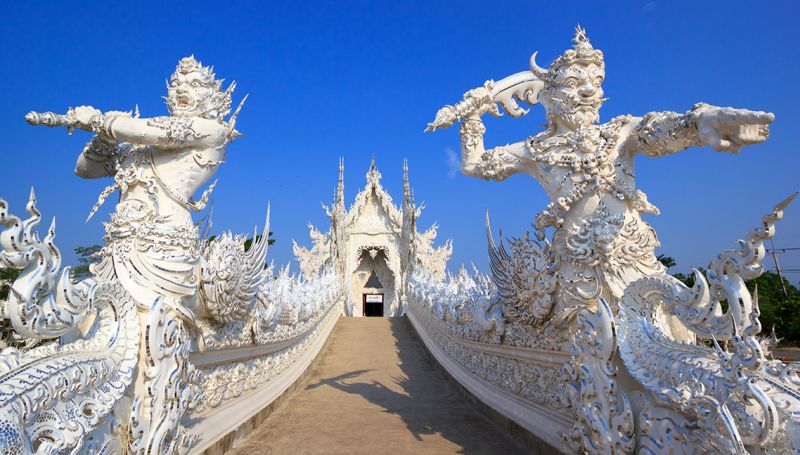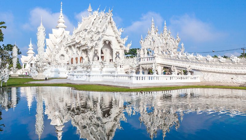 Visit Rong Khun Temple (White’s Temple), designed by the famous national artist. The main temple building is a distinctive white color, decorated with fragments of reflective glass which can be seen from afar.