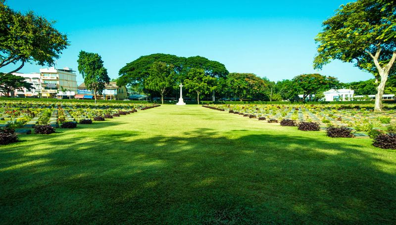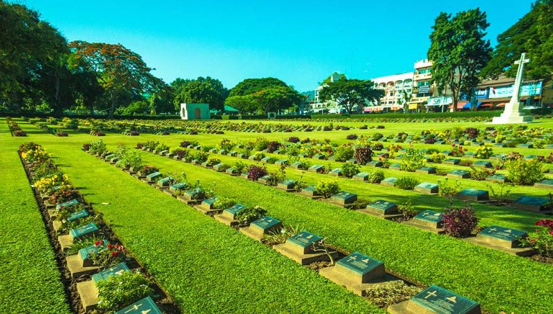 Continue to Kanchanaburi War Cemetery. It contains the remains of 6,982 war prisoners (mostly the British, Dutch, Australian and American) who lost their lives during the construction of the Bridge over the River Kwai and the railway to Burma (the Death Railway).