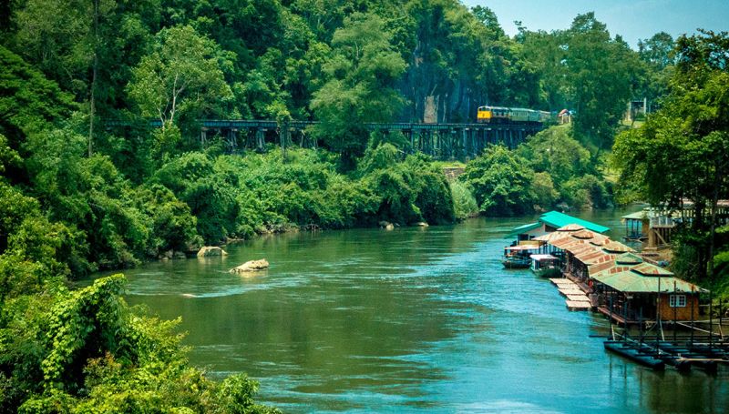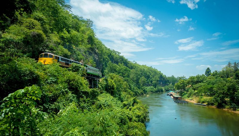 Train ride on Death Railway through magnificent scenery, passing over the original wooden viaduct constructed by Allied POWs.