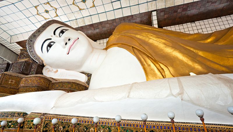 Continue to Shwethalyaung Buddha, a huge reclining Buddha with a sign on the platform in front of the image giving the measurements of each body part. It is reputed to be one of the most lifelike of all reclining Buddhas. The Burmese say the image represents Buddha resting after attaining nirvana.